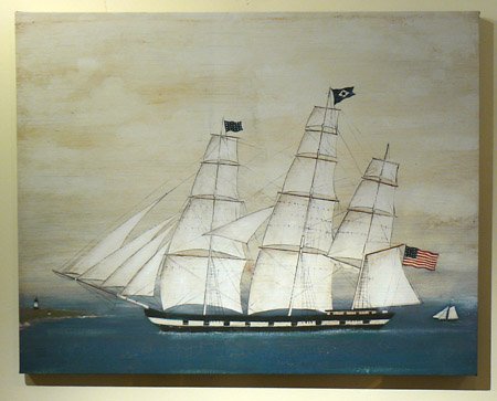 This nautical artwork features a sailing schooner with a small lighthouse in the background. This is a lithograph of a ship on canvas wrapped around a wood backing. Ship also features an American flag flying off the back. Artwork measures 28 inches x 22 inches..../ Sailing Schooner Lithograph on Canvas / Brands Furniture